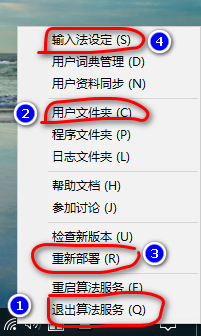 右击输入法的图标,先“退出算法服务”,打开“用户文件夹”。
