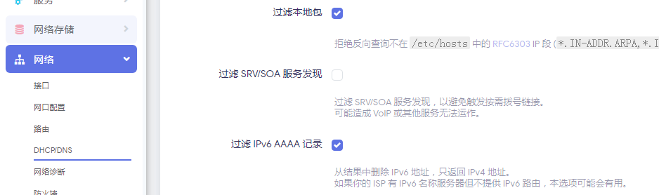 iStoreOS默认开启了“过滤IPv6 AAAA记录”,为了确保网络通畅,需要关闭该功能并保存应用。