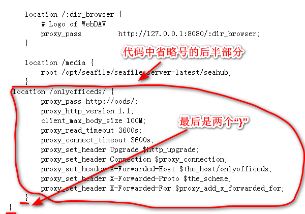 插入以下代码到seafile.nginx,为了防止出错,需要备份。