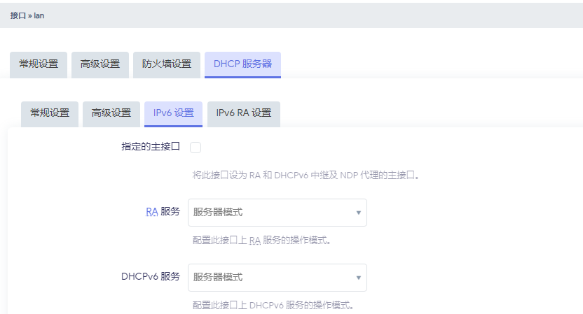 在DHCP服务器的IPv6设置中,选择服务器模式,禁用NDP代理,其他选项保持默认。保存并应用设置。
